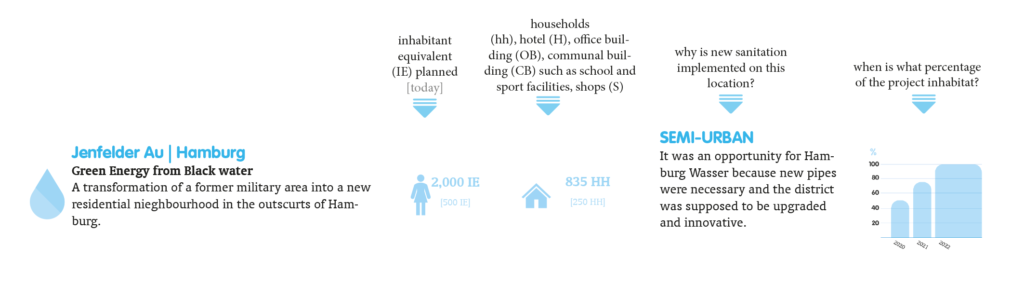 Gelegen op het terrein van de voormalige militaire kazerne Lettow-Vorbeck in het district Hamburg-Jenfeld, is het project Jenfelder Au gericht op de bouw van 835 huishoudens waarin gebruik wordt gemaakt van de Hamburg Water Cycle ©: een gesloten kringloopsysteem voor afvalwaterbeheer.