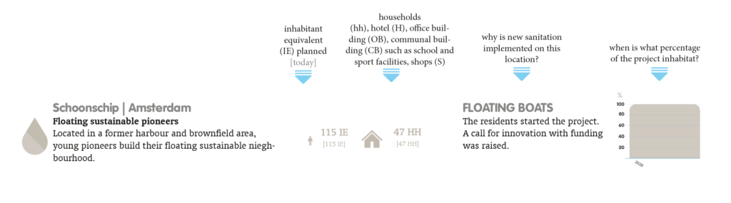 Gevestigd in het noorden van Amsterdam is Schoonschip een woonwijk bestaande uit woonboten, geïnitieerd door de bewoners zelf. Deze 30 woonboten, goed voor 46 huishoudens, vormen samen “de meest duurzame drijvende wijk van Europa” en beschikken over een gemeenschappelijke ruimte om de sociale samenhang en gedeelde elektrische mobiliteit te versterken.